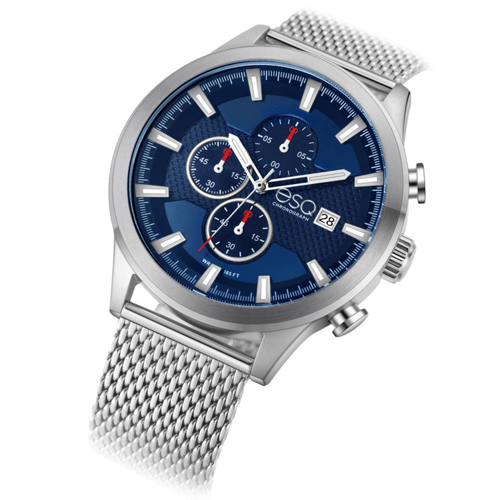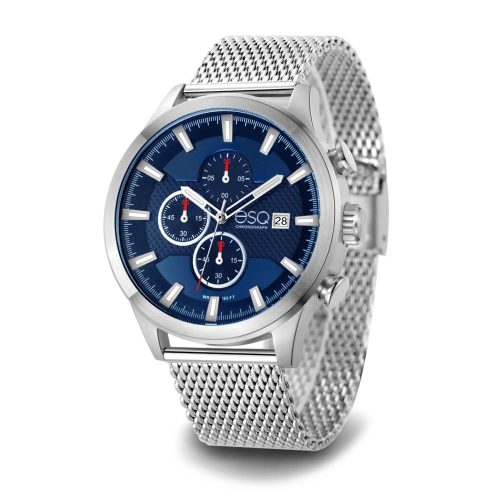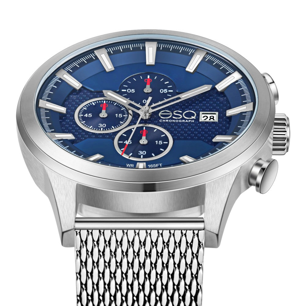 ESQ - Steel Case / Blue Dial With Red Accents 46mm Stainless Steel Case, 22mm Stainless Steel Mesh Bracelet, Chronograph Movement, 165 Feet Water Resistance.