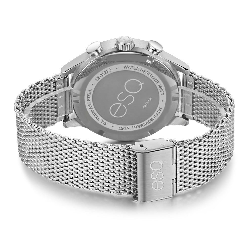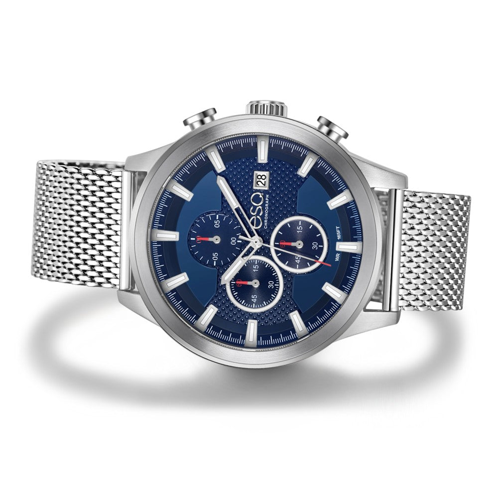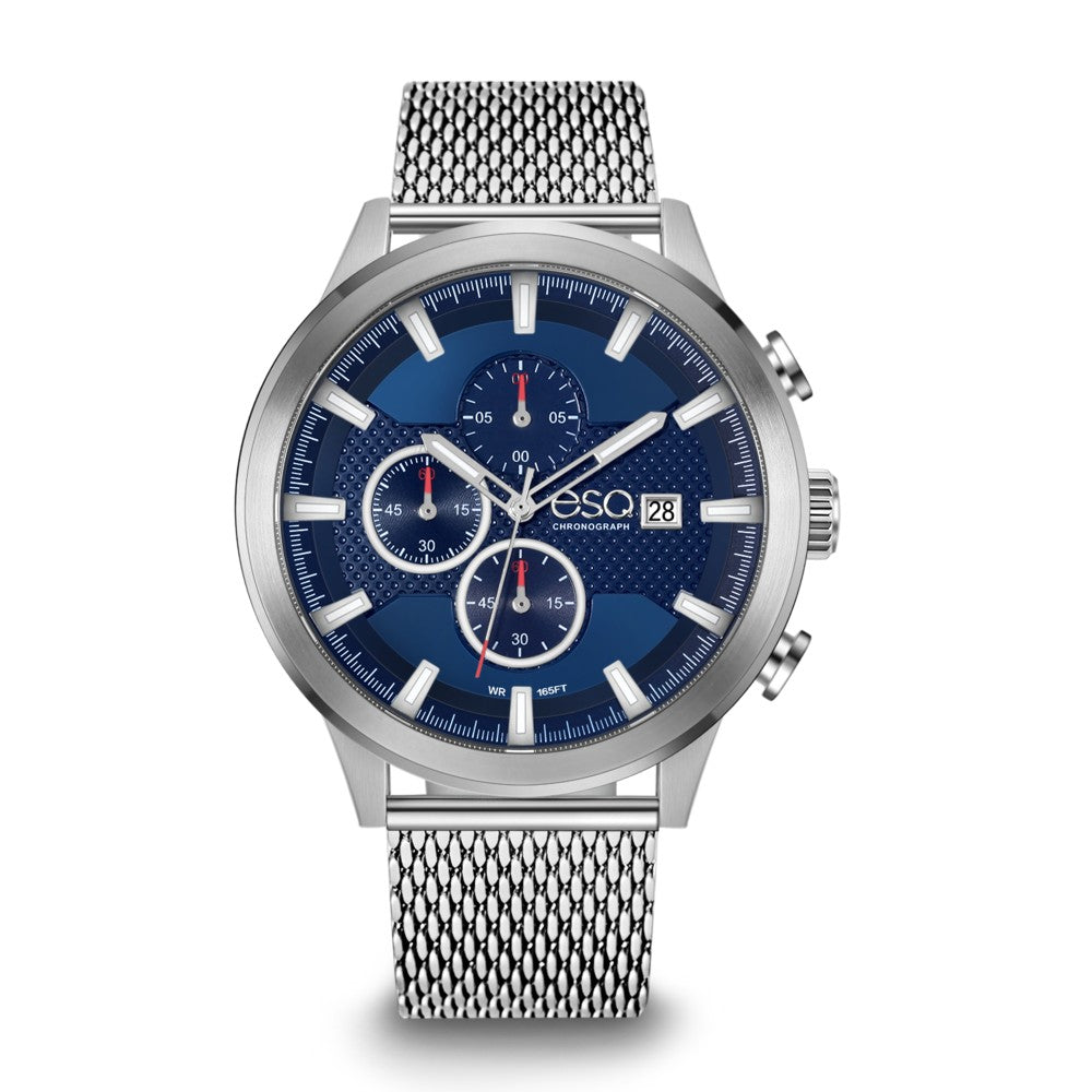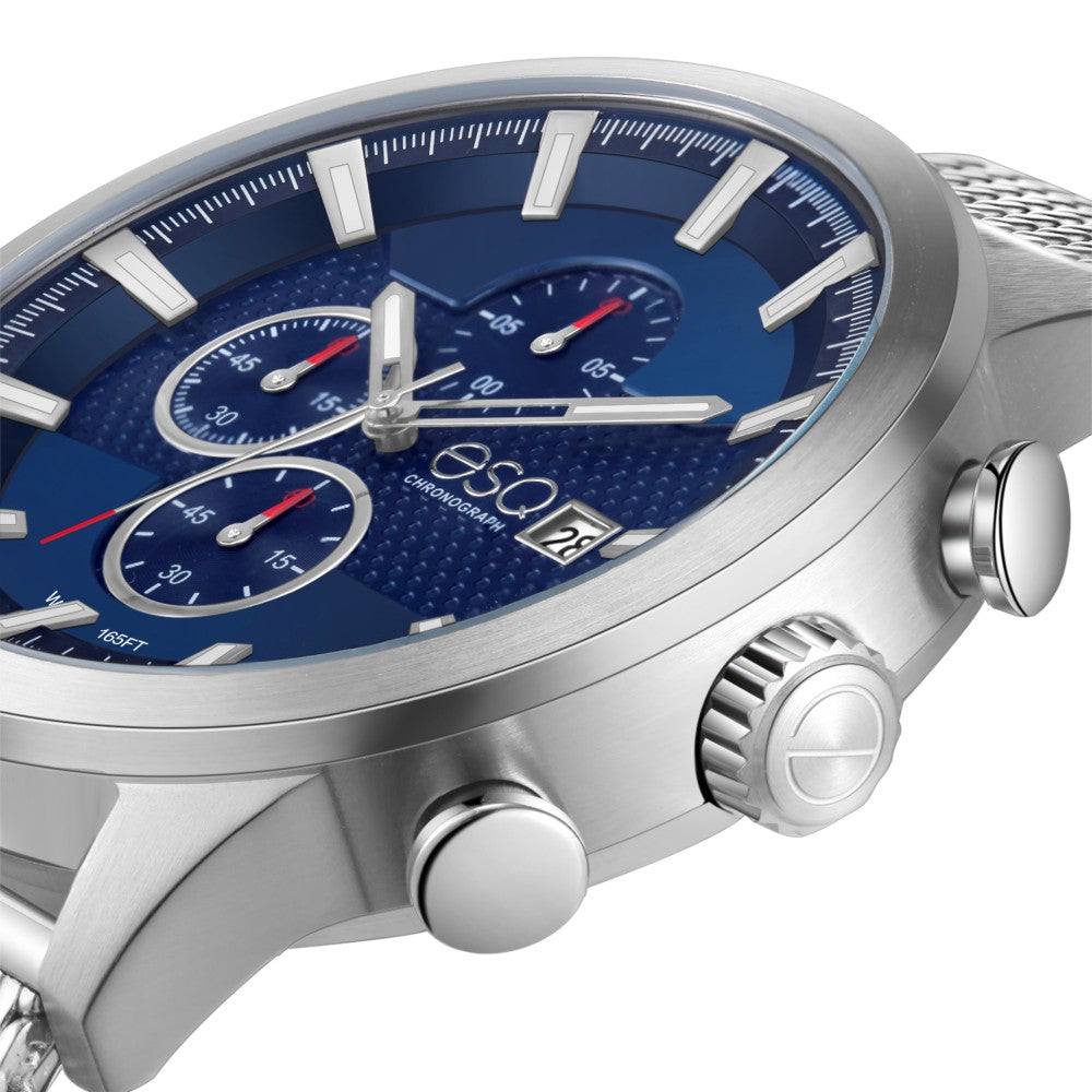 ESQ - Steel Case / Blue Dial With Red Accents 46mm Stainless Steel Case, 22mm Stainless Steel Mesh Bracelet, Chronograph Movement, 165 Feet Water Resistance.
